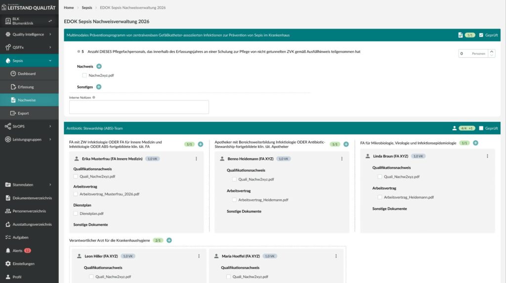 Der EDOK Sepsis-Manager dient der gesetzlich verpflichtenden Erhebung und dem zeitgerechten Versand der einrichtungsbezogenen QS-Dokumentation nach DeQS-RL im Verfahren Sepsis (SEPSIS-E). Die strukturierte Verwaltung aller relevanten Nachweise im EDOK Sepsis-Manager ermöglicht es Ihnen, die benötigten Dokumente – insbesondere zur personellen Ausstattung sowie zu SOPs – jederzeit zentral und sicher verfügbar zu halten. Zudem haben Sie jederzeit die resultierenden Qualitätsindikatoren im Blick!